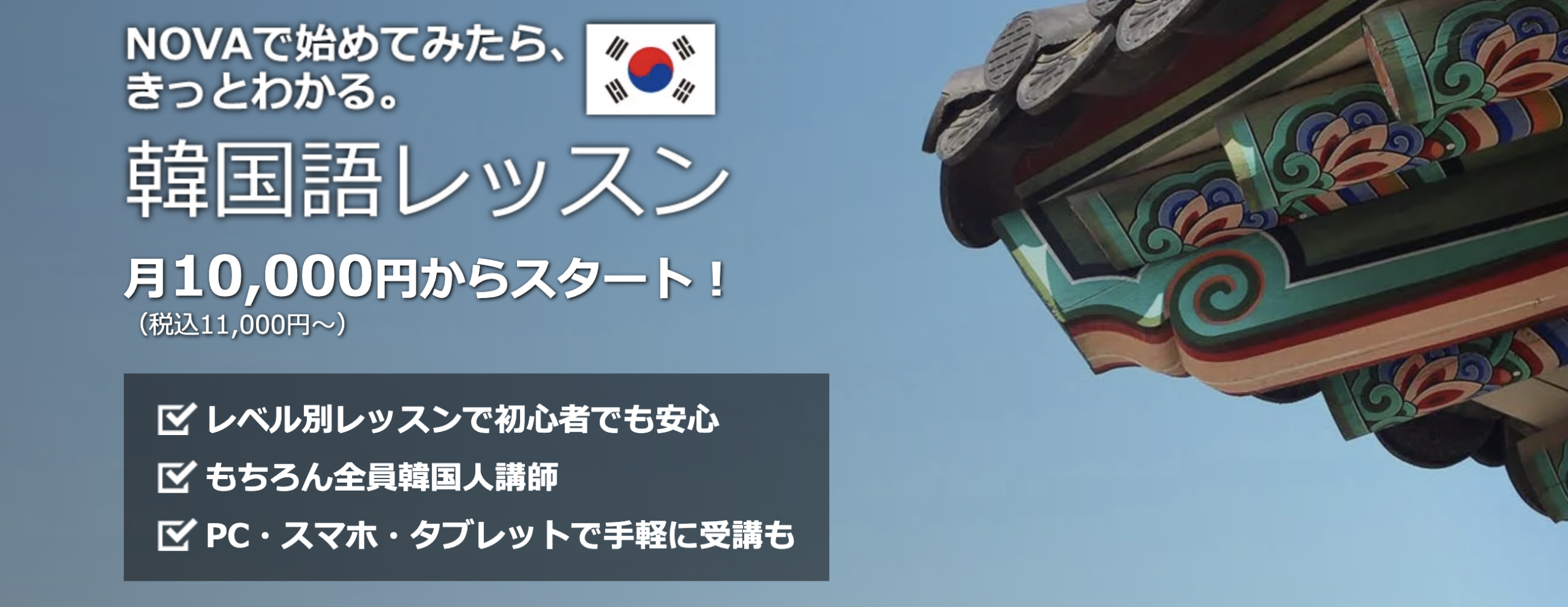 NOVAは英会話スクールとして有名ですが、韓国語講座も提供しています。気軽に語学学習を始めたい人向けのスクールです。